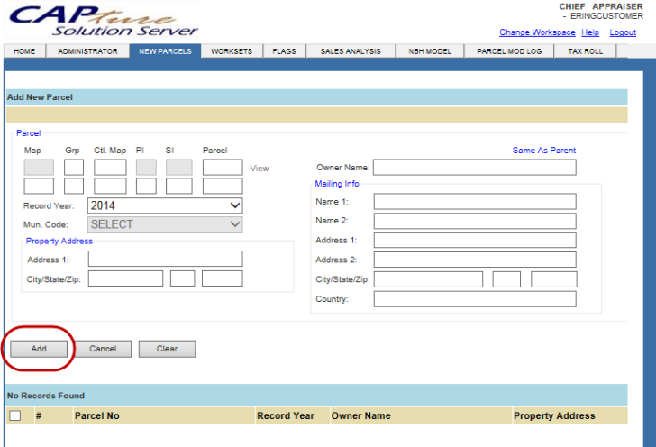 In Capture users are able to create new parcels through the New Parcels tab on the main workspace with an SI if it is not deed driven. The parcel format is specific to each jurisdiction and this screen is made up of text fields that allow the user to enter and track parcel information. The parcel is created upon entering the necessary information and selecting add. This information is also displayed on the Legal tab of the Property Record Card. Modifications can be made to the new parcel through the Legal tab.