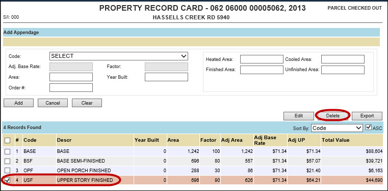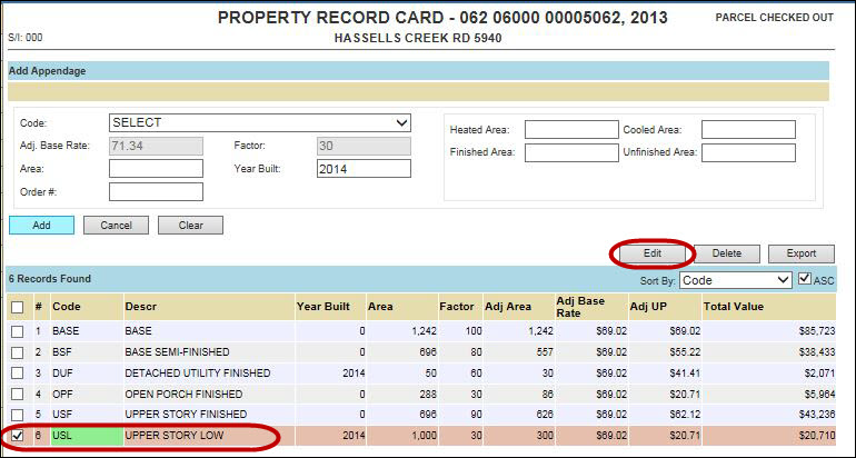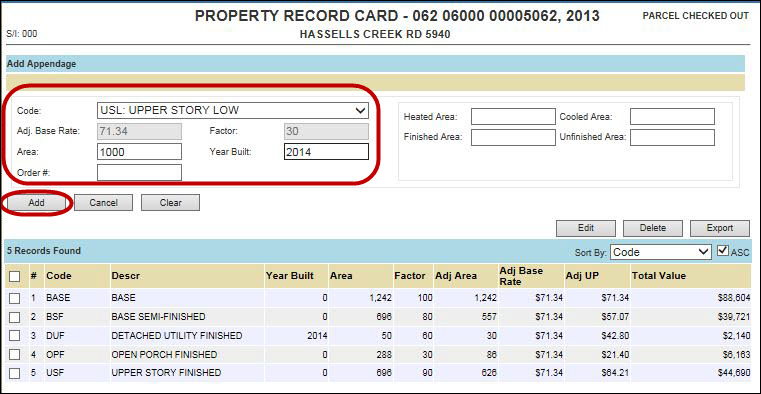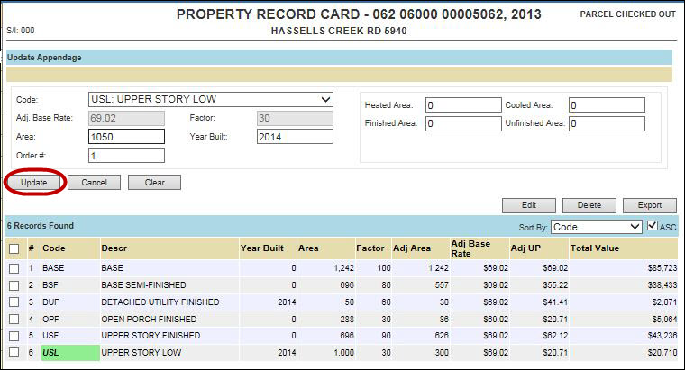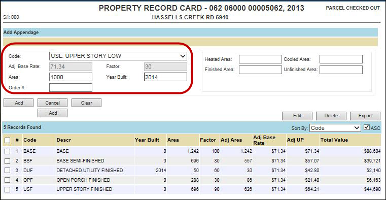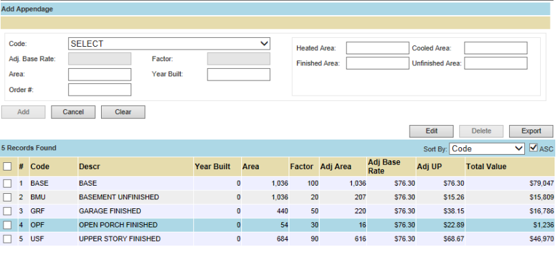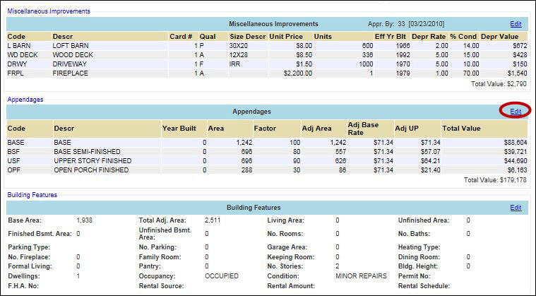 Appendages are additions, such as garages and porches, to the base area of buildings that may be specific to a particular county. Capture allows users to add, edit, and delete appendages manually or through the use of the Sketch Module. Appendages can be accessed through the building link on the parcel’s General Info tab and then worked through the Appendages section. Appendages are automatically entered when the Sketch Module is used to create buildings. To access the Sketch Module click the Appraise button located within the building link on the parcel’s General Info tab.